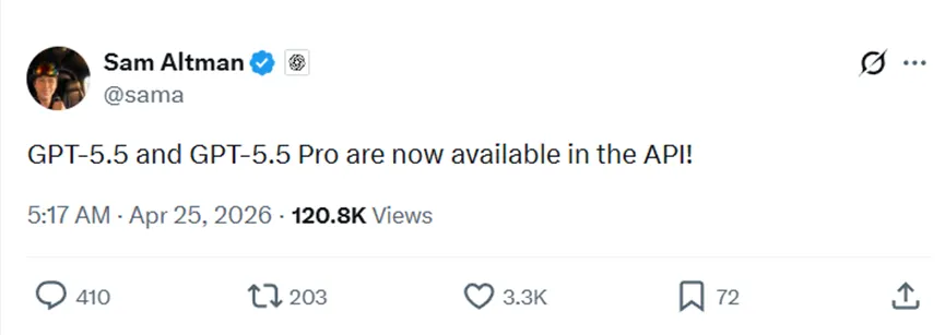 而OpenAI的首席执行官也在今天早上5点宣布,开放了GPT-5.5和Pro版本的API,大家可以在OpenClaw中使用啦。