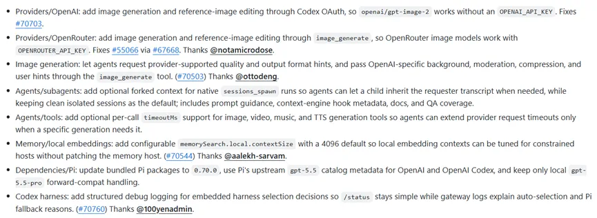 这次更新把内置的Pi工具包升级到了0.70.0版本,专门对接了GPT-5.5的最新元数据。