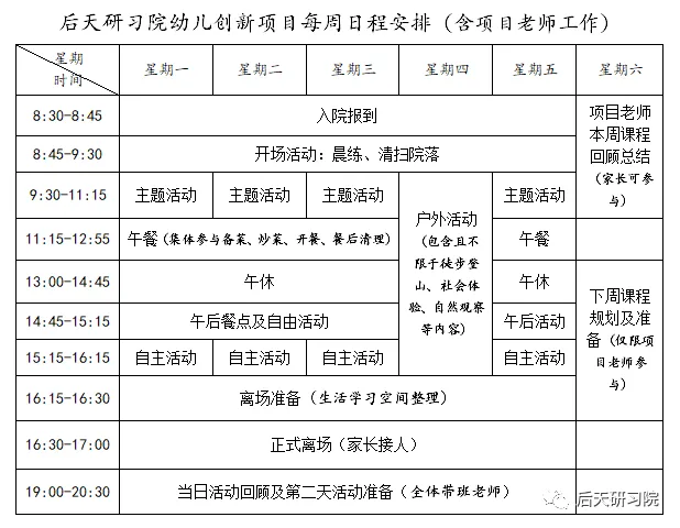 课程将遵从以培养儿童应对未来人工智能发展为核心原则,每周课程安排分别按体能锻炼、劳动教育、艺术教育、食物教育、创意手工、戏剧教育、自然体育等每日主题内容开展。在引导孩子们自主开展的各种主题活动中融入全人教育及儿童创造力培养相关内容。