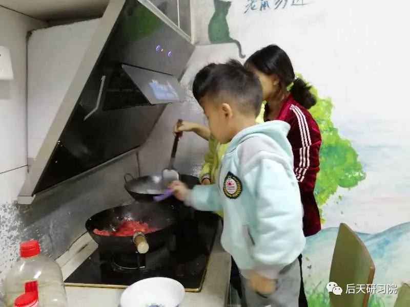 基于儿童食品安全保障前提下,每天午餐由孩子们与老师共同参与制作。从煮饭、洗菜、切菜、炒菜到餐后厨房清理,全部由孩子们共同参与完成。