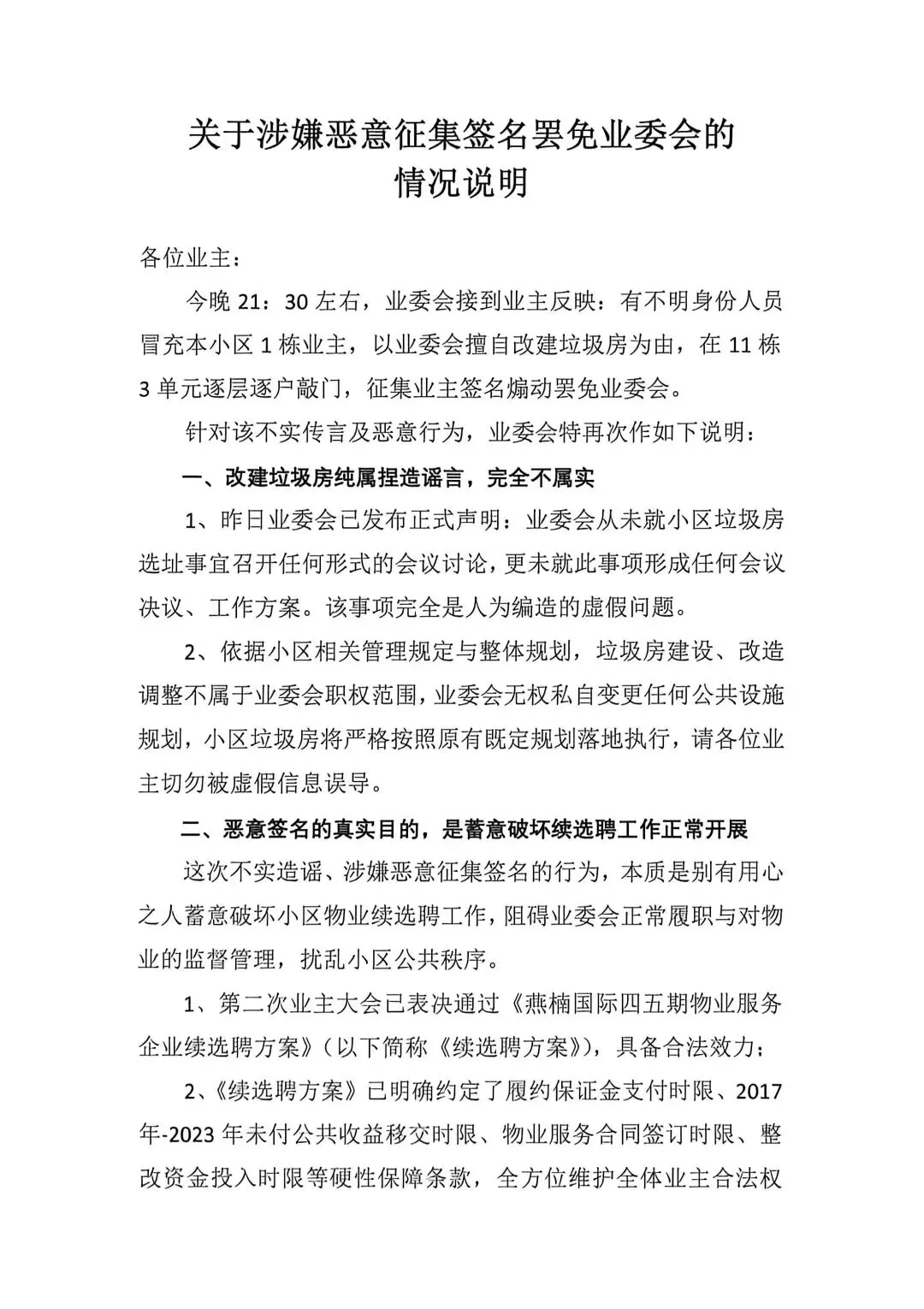 关于涉嫌恶意征集签名罢免业委会的 情况说明
