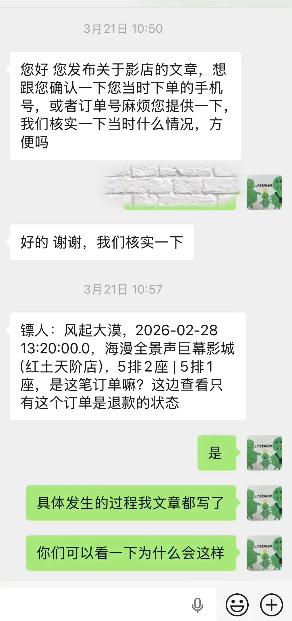 一直觉得我写公众号是瞎折腾的王同学跟我说:“哎哟,你还挺厉害的嘛,写了一篇文章,还能让平台给我使劲儿道歉。”原因是前一段时间,王同学因为试用影店APP退票遇到的一件吃苍蝇的事情,很郁闷,然后我就发文章吐槽了一下。具体参考文章彻底被“影店”这一波操作给恶心到了~差不多过了两周,这个APP的工作人员就来跟我联系了,要我提供一些信息来核实一下当时的情况。