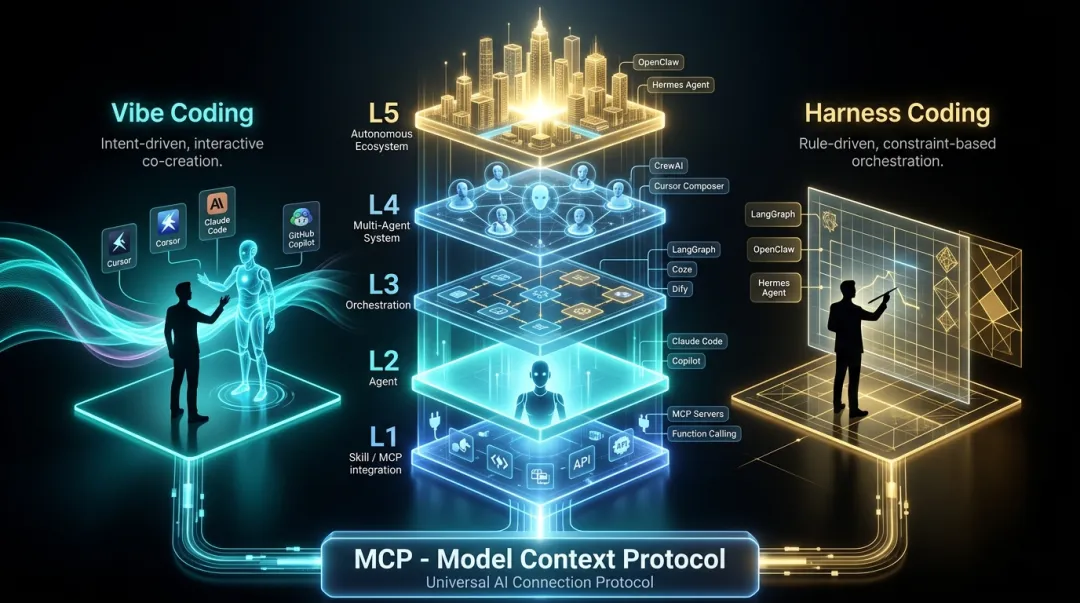 后台有人私信我,AI 的概念和工具层出不穷,让人很容易迷失在各种缩写和名词里——MCP、Agent、Vibe Coding、Harness Coding、Cursor、Claude Code、Coze、OpenClaw……