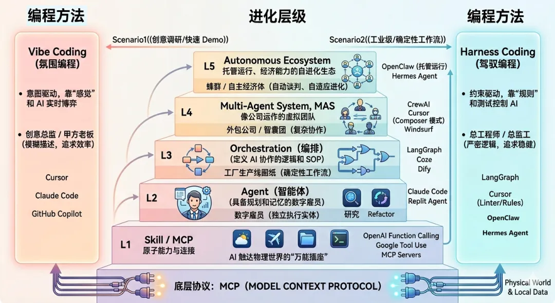 你想让 AI 帮你做一件具体的事?从 L1 MCP 开始。 你想让 AI 独立完成一个任务?找 L2 Agent。 你想让 AI 按照你的流程协作运行?上 L3 编排。 你想让 AI 像团队一样分工?用 L4 多智能体。 你想让 AI 自主运转、自动进化?那已经是 L5 了。