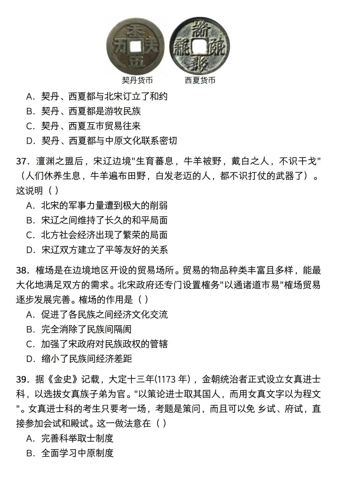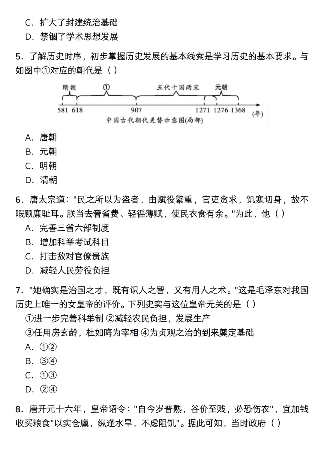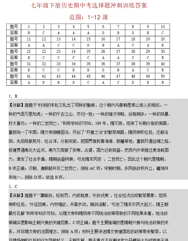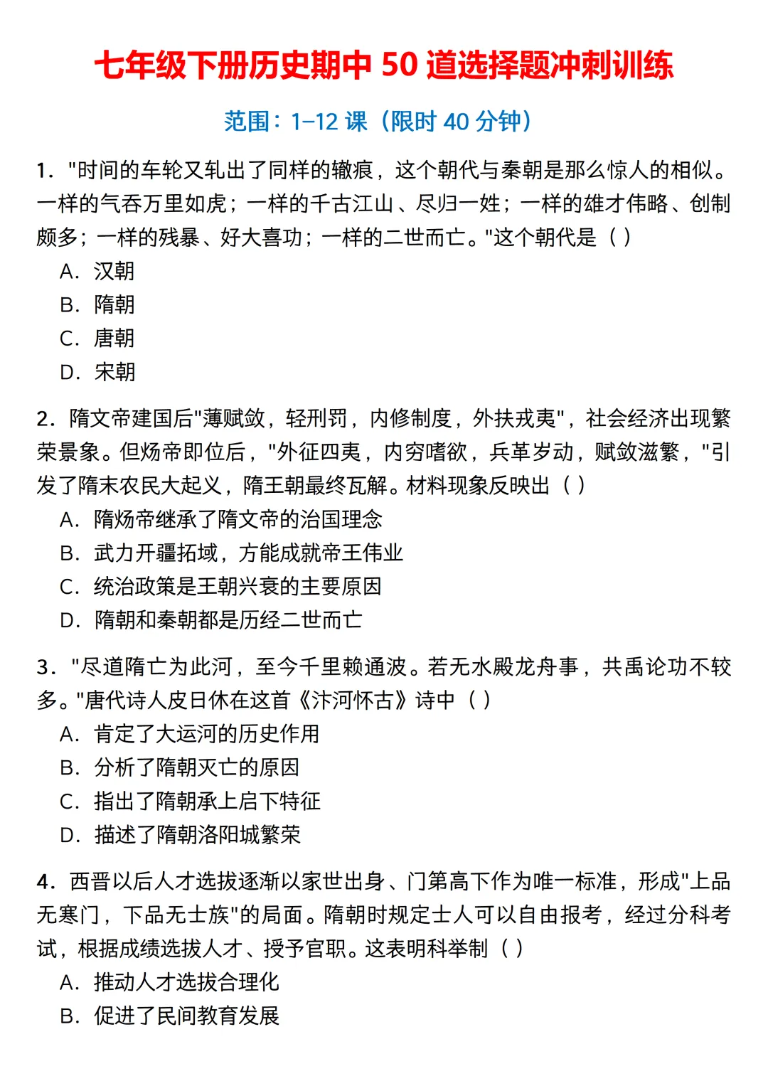 内容范围刚好涵盖隋唐到宋元时期。考虑到平时的碎片时间,这份练习没有凑完整的题型,纯粹是一个七下历史选择题专练。题目一共50道单选,设定了40分钟的限时,主要用来给学生摸底基础史实,以及熟悉一些常考的史料阅读。