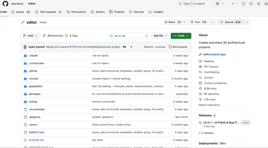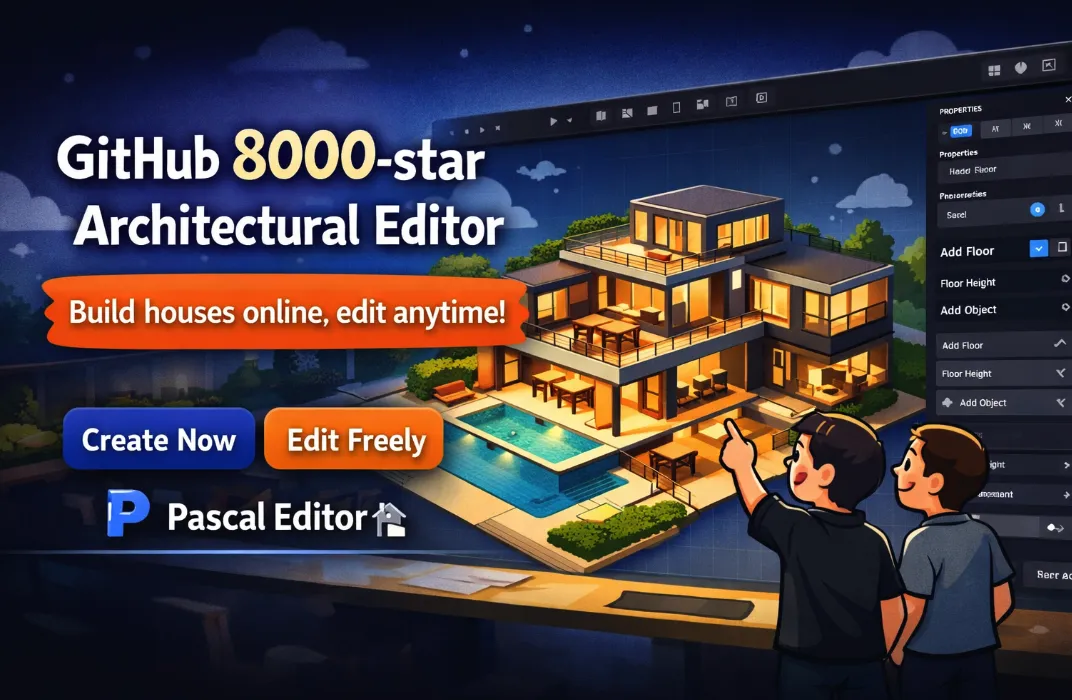 Pascal Editor 这个项目有意思,就有意思在这里。它不是单纯给你看一张效果图,而是在认真做一个能在线创建、能继续编辑、还能公开分享的建筑编辑器。GitHub 现在已经超过 8 千星,官方在线站点也已经开放体验。