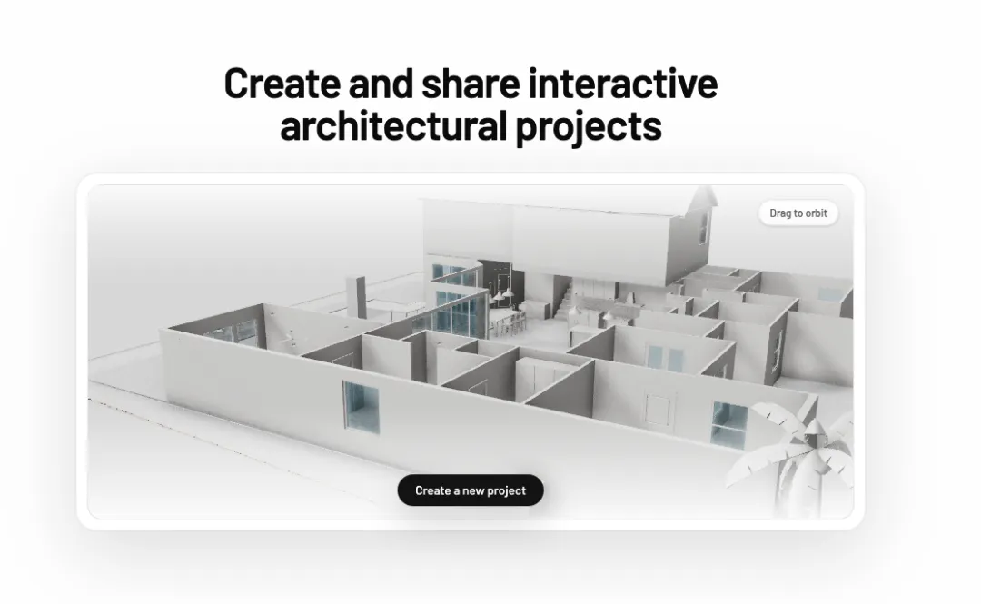 这一点,从它的在线产品表达就能看出来。官网首页不是那种典型的开源项目 landing page,也不是放几张渲染图就完事,而是直接写着“Create and share interactive architectural projects”,下面接的是创建入口和一批社区项目。社区页还能按 views、likes 和 newest 去浏览公开作品。说白了,它想做的不是一个孤立 demo,而是一个能创建、能浏览、能传播的在线建筑编辑器。