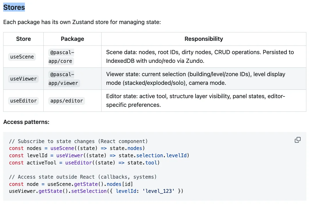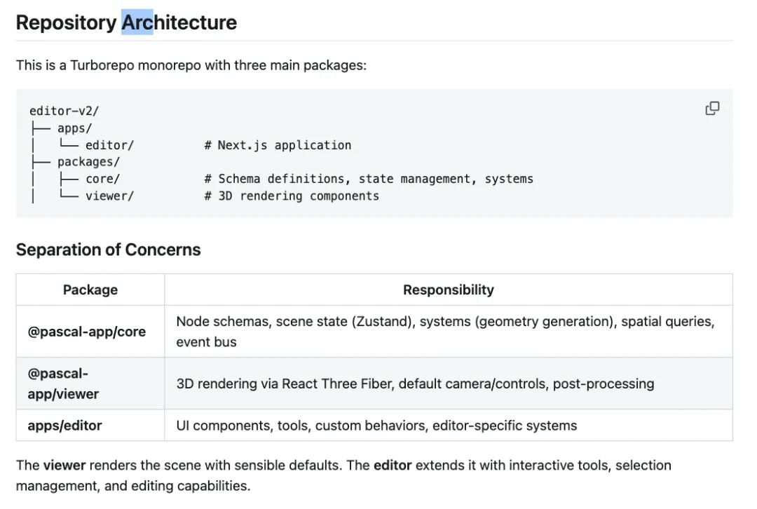 从仓库结构看,Pascal Editor 是一个 Turborepo monorepo,而且把核心能力拆成了三层:editor 负责 UI、工具和交互,viewer 负责 3D 渲染,core 负责 schema、状态和系统。README 和项目文档里还能看到它用的是 React 19、Next.js 16、Three.js 的 WebGPU renderer、React Three Fiber、Zustand 和 Zundo 这一套。这套拆法本身就在说明,它不是一次性效果演示,而是在搭一个可维护的建筑编辑引擎。