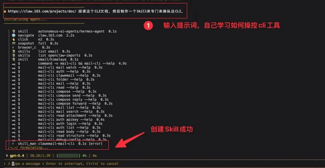 我以 Hermes 为例,利用它的自学习迭代能力,它很快学会使用了这个CLI