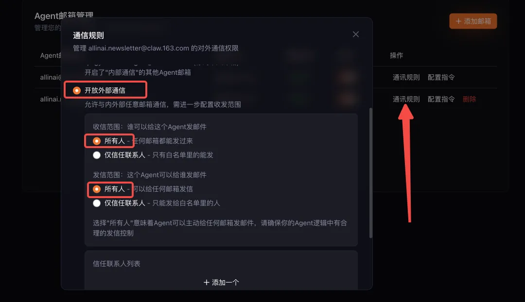 再把子邮箱的通信规则打开:开放外部通信,选择所有人