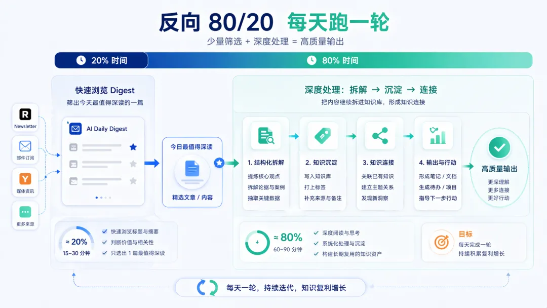 用 20% 的时间做第一轮筛选,把 80% 的精力放在真正值得深读和编译的内容上