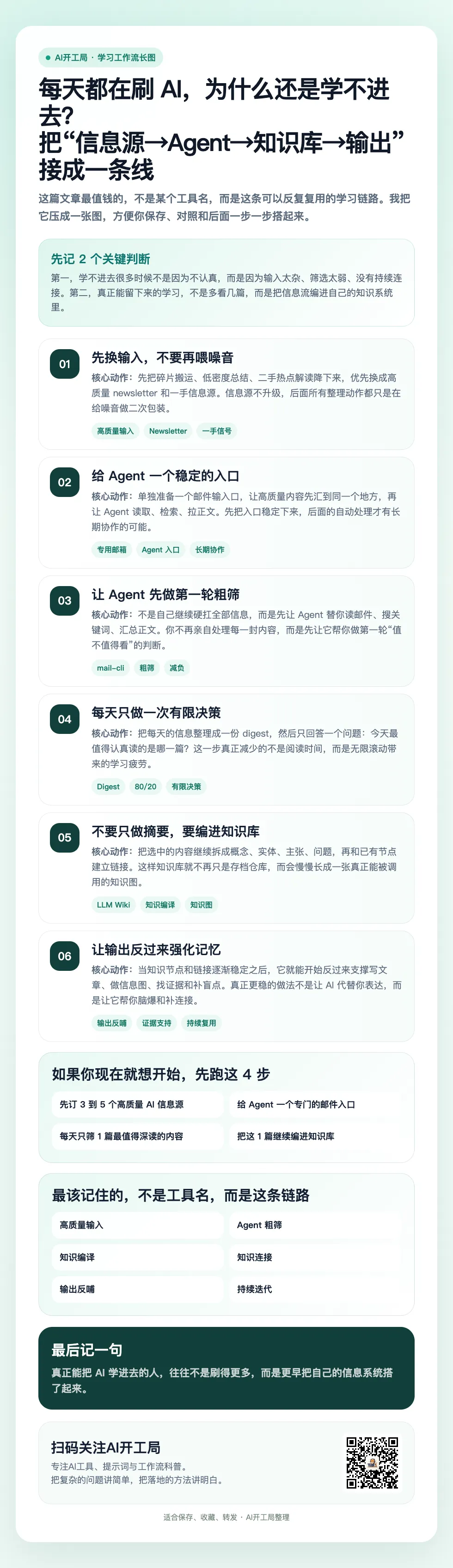 核心不是多刷内容,而是先把“信息源 -> Agent -> 知识库”的主管道搭起来
