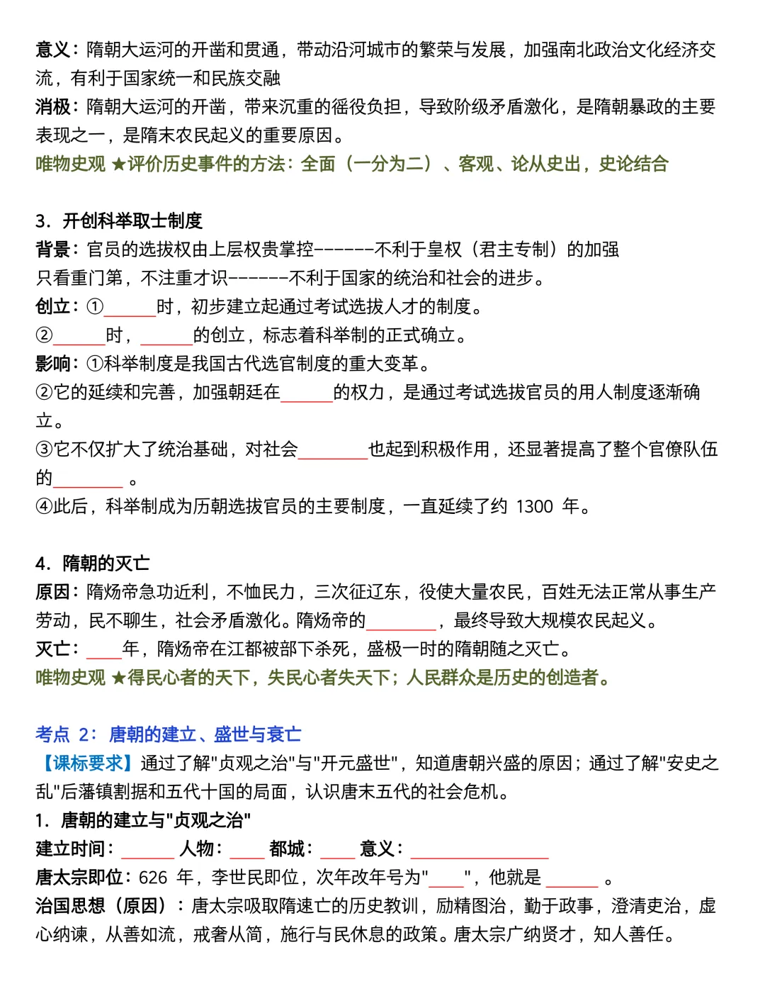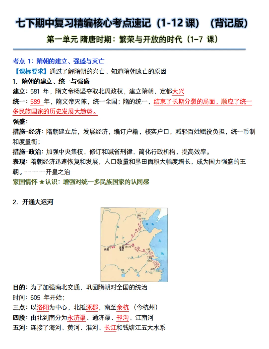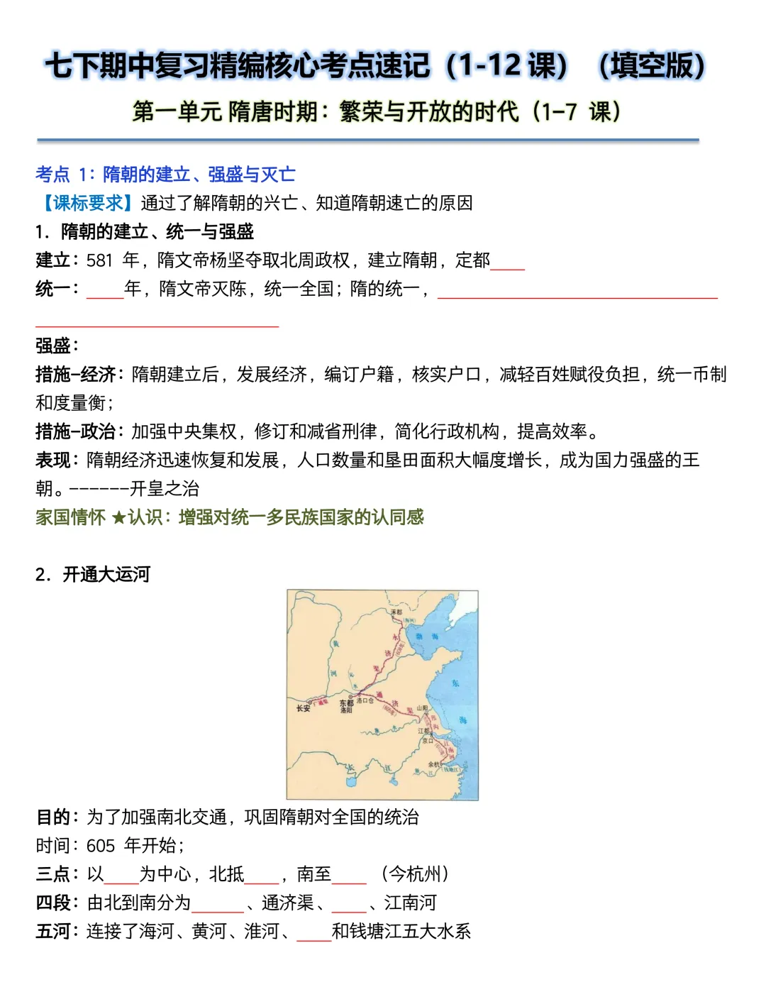这次整理的范围涵盖了1-12课的核心考点,从隋唐的繁荣开放到辽宋夏金元的民族交融及经济重心南移,基本盘点了各个阶段的朝代更迭与重要制度。平时在后台常看到大家在找七年级下册历史期中必考知识点,如果孩子只捧着课本原原本本地翻,内容难免有些散,复习和记忆的效率也不高。