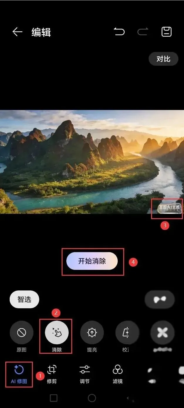 进入手机相册,选中图片后点编辑,再找AI修图或者消除功能。