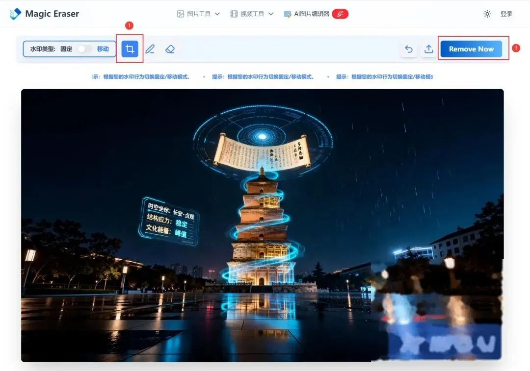 如果是视频,就上传视频文件,框选水印位置,然后点击Remove Now。