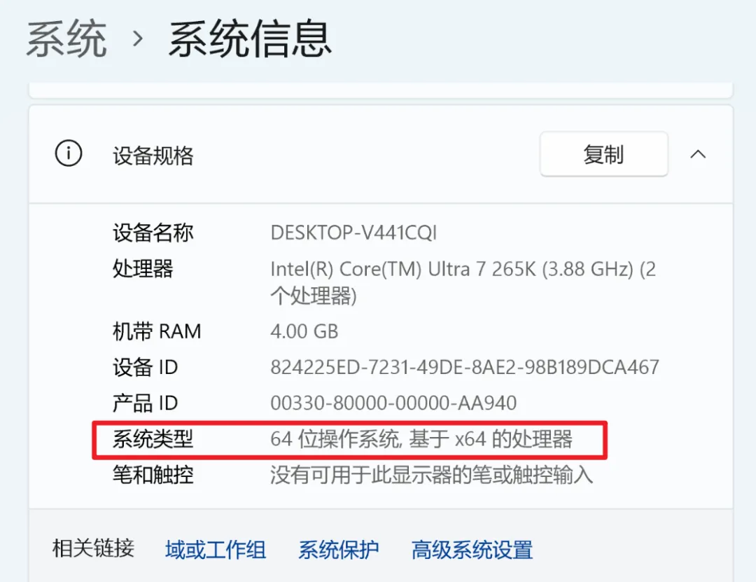 备注:注意选择适合自己电脑体系的版本,在系统信息-设备规格内查看。