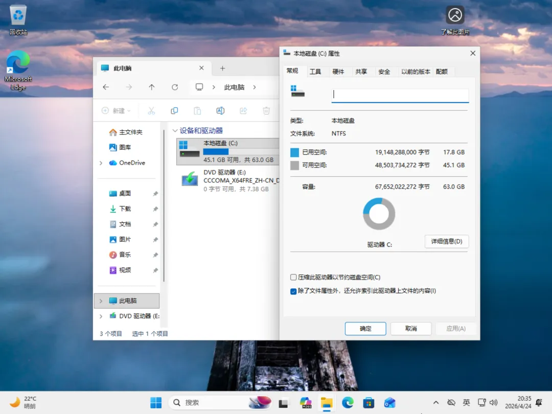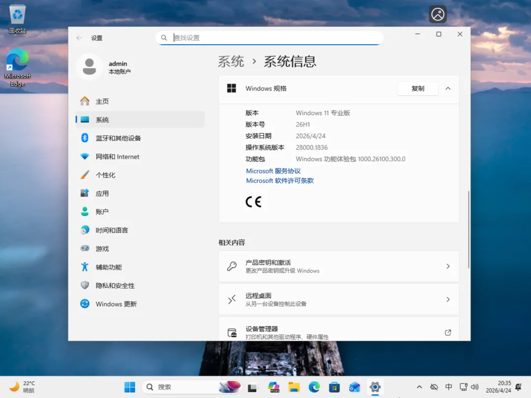 安装后系统信息如图,版本号 28000.1836 (26H1)