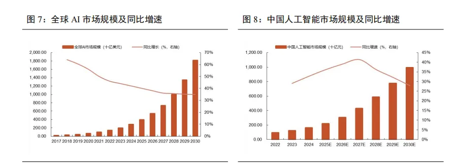 海内外AI应用在高基数下持续扩张,且场景持续外溢。全球AI用户规模呈现指数级爆发增长,根据Xsignal数据,截止2025年11月,海外AI应用月活跃用户(MAU)已突破15亿,同比增长79.3%;中国AI应用月活跃用户(MAU)达到5.4亿,同比增长130.19%。随着生成式人工智能多模态能力的显著提升,文本、图像、音频、视频等数据可以直接由人工智能模型进行处理,从而进一步扩展了该技术的应用场景。同时,随着AI技术在垂直领域,例如信息检索、游戏、购物决策等环节的加速渗透,用户依赖度持续攀升,推动AI应用市场规模持续扩容。根据GrandviewResearch数据,2025年全球AI市场规模近4000亿美元,预计至2030年将突破1.8万亿美元,年复合增长率为37.3%。