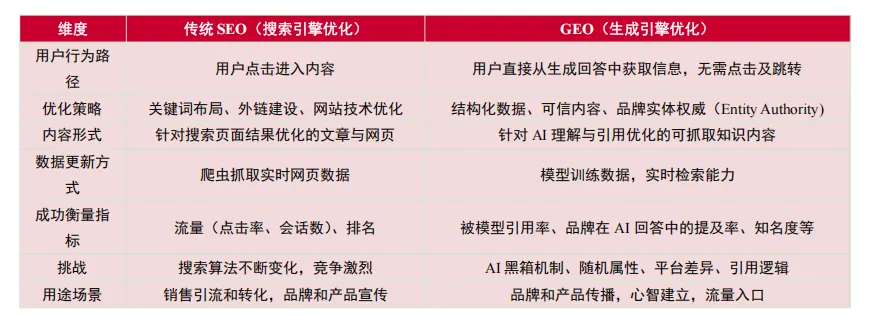 GEO与SEO的核心区别在于从“被搜索到”到“AI替你说”。SEO主要与遵循明确规则的网络爬虫互动;GEO则需与基于复杂神经网络、具备强大语义理解与逻辑推理能力的AI模型互动,其“规则”是动态且更具认知性的。GEO并非SEO的替代,而是其在AI时代的战略演进与能力扩展。