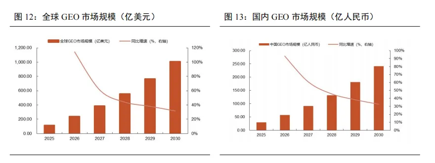 25年全球GEO市场规模破百亿,国内GEO市场规模近30亿元。随着人工智能技术的不断进步和应用场景的拓展,GEO(生成引擎优化)市场正迎来较快的增长机遇。根据秒针营销科学院预测,2025年全球GEO市场规模为112亿美元,中国GEO市场规模为29亿元。预计2030年全球市场规模破千亿美元,中国市场规模达240亿元。