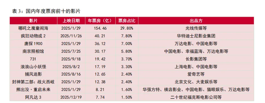 需求端层面:25年全年票房稳中有进,其中动画电影表现较为突出。2025年国内电影市场票房收入达518.18亿元,同比增长21.65%,恢复至2019年同期的81.52%。拆分来看,2025年观影人次为12.38亿,同比增长22.74%;放映场次为0.93亿,同比下降1.06%,主要系多个重要档期内诞生头部爆款影片,以超预期的票房表现共同助力了全年大盘的不断抬升。从票房分布来看,25年电影市场结构正在逐步调整。其中,全年票房TOP10新片中,4部超30亿,8部超10亿。同时,动画电影成为25年票房核心增长引擎,动画电影票房接近全年总票房的一半,其中《哪吒之魔童闹海》动画电影票房创下历史新高达到154亿元,占全年票房的29.8%。