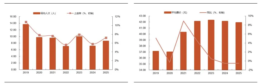 场均人次及上座率均有所反弹,平均票价连续两年下滑。从场均及上座率角度来看,2025年场均人次8.6人、上座率7.2%,同比去年均上升两成。从票价角度来看,2025年平均票价为41.9元,同比去年下降0.2元,主要系近三年下沉市场力度加大,其中三四线城市票房占比逐年提升。