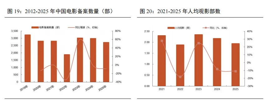 供给端层面,电影备案数量呈现持续下降趋势,电影市场从“要数量”转向“要质量”。根据国家电影局公布的电影剧本备案数量情况来看,24年全年电影备案数量为2975部,同比下降1.13%。25年电影备案数量为2709部,同比下降8.94%。21-25年观众人均观影部数逐年下滑,腰部影片数量骤减导致今年下降幅度较大,其中观看4部及以上影片的观众比例下降最为明显。同时,根据灯塔研究院调研,观众对内容的“创新型”“当下性”要求提升,61%的受访者将“故事题材吸引力”列为首要观影动机。这说明国内电影市场逐步从“要数量”转至“要质量”的新阶段。