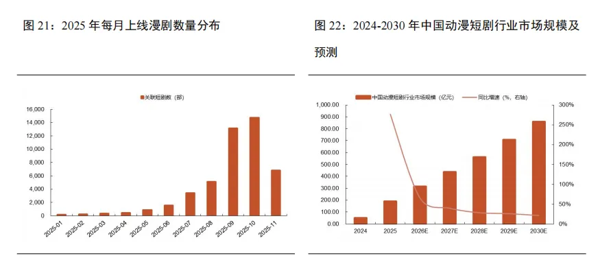 “漫剧”作为新兴内容形态,AI助力生产增效显著、增长路径清晰,预计2026年起进入高速增长阶段。2024年年末,漫剧集中爆发,接连涌现多部播放量过亿作品,并快速完成商业化探索。根据巨量引擎数据显示,2024年四季度漫剧观看人次超20亿,付费规模2600万元。2025年随着AI技术的不断成熟,不仅大幅提升漫剧制作效率、降低成本,更推动行业进入加速扩张新阶段。以火山引擎的AI模型为例,其AI模型矩阵贯穿了剧本创作、分镜图设计、分镜视频生成、配音音效、后期剪辑这五大核心环节,成功将制作周期缩短80%-90%,制作成本降低70%-90%。根据DataEye-ADX行业版数据显示,2025年为漫剧市场爆发元年,全年上线数量实现跨越式增长,截止25年11月,上线数量约4.7万部。在平台政策与行业创新的双轮驱动下,中国动漫短剧行业正迎来高速发展期。根据艾媒咨询预测,2030年中国动漫短剧行业市场规模将超850亿元。