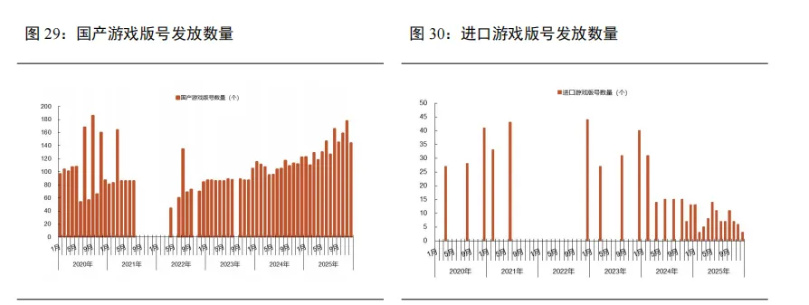 全年国产游戏版号数创新高,游戏产业迎来春暖。2023年整体版号发放节奏和数量都逐步趋于稳定,全年发放游戏版号1075款,其中国产977款,进口98款。2024年版号发放力度再次加大,其中国产游戏版号月均发放数量过百,进口游戏版号发放速度加快。根据国家新闻出版署数据,2024年共发放游戏版号1416款,其中国产1306款,进口110款。2025年游戏版号发放已完全步入规律化、常态化新阶段,2025年共发放游戏版号1711款,其中国产1676款,进口95款。全年月均稳定下发版号,且单月数量均超过100款,其中11月以184个过审数量创下年内高峰,为未来游戏厂商的长线产品规划提供了稳定的供给环境,展现出国内游戏市场已逐步步入全面复苏的态势。