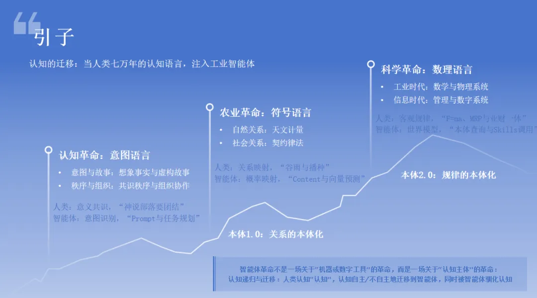 今天,站在这个人类认知长河的入海口,能完全代替企业用户认知与行动的工业级AI Agent智能体,需要完成这三套驱动人类文明的认知语言的系统性地迁移,使其具备人类花了七万年建立起的从意图规划到实体关系最后到因果规律的完整认知体系: