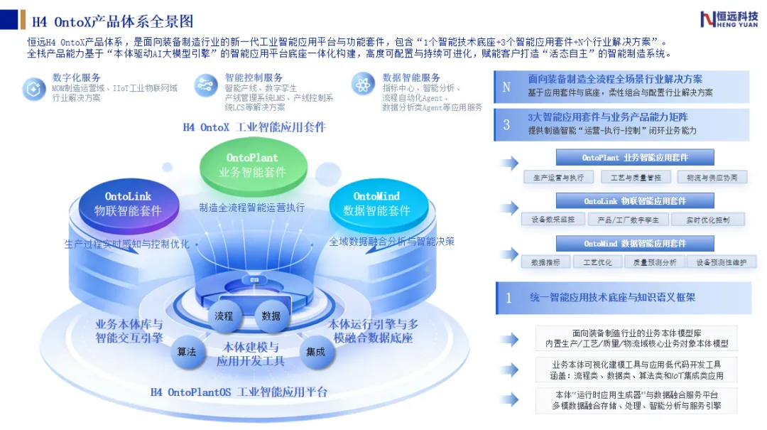 恒远H4 OntoX产品为客户交付的,是一个能感知、会分析、懂执行、可进化的工业认知生命体。