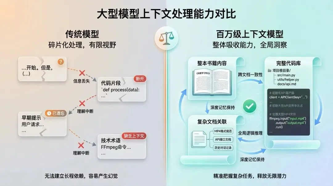 这意味着什么?意味着百万上下文终于从之前的 “实验室里的展示品”,变成了人人都能用得起的日常功能。之前,很多企业因为成本的问题,不敢用长上下文模型,现在,他们可以用很低的成本,一次性处理整本小说、整个代码库、整份合同,实现全局的理解和处理。比如,之前的代码助手,只能处理单个文件,现在,你可以把整个百万行的代码库一次性输入给模型,让它帮你做全栈的重构、调试、功能开发,而不需要拆分文件,这就是真正的工程级 AI 助手。