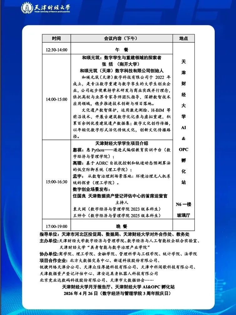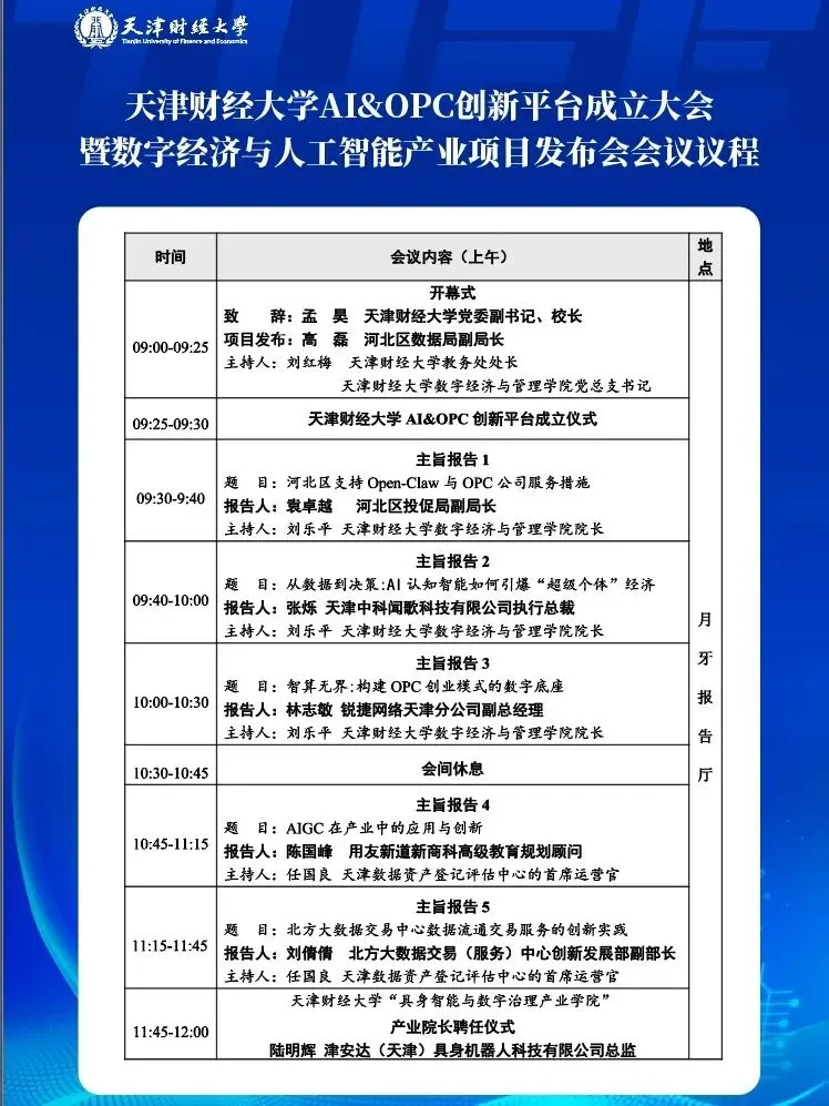 天津财经大学AI&OPC创新平台成立大会——暨数字经济与人工智能产业项目发布会会议议程