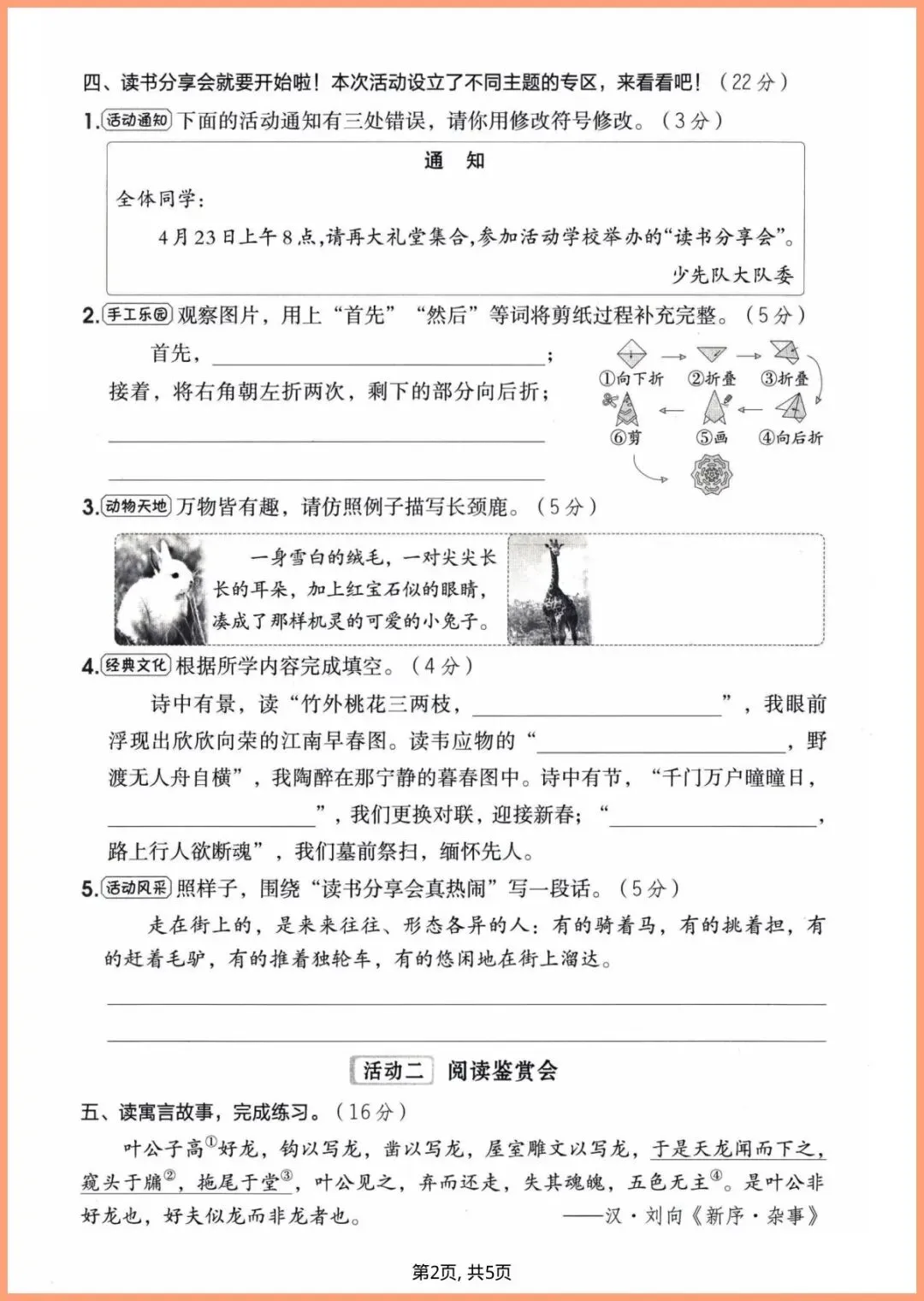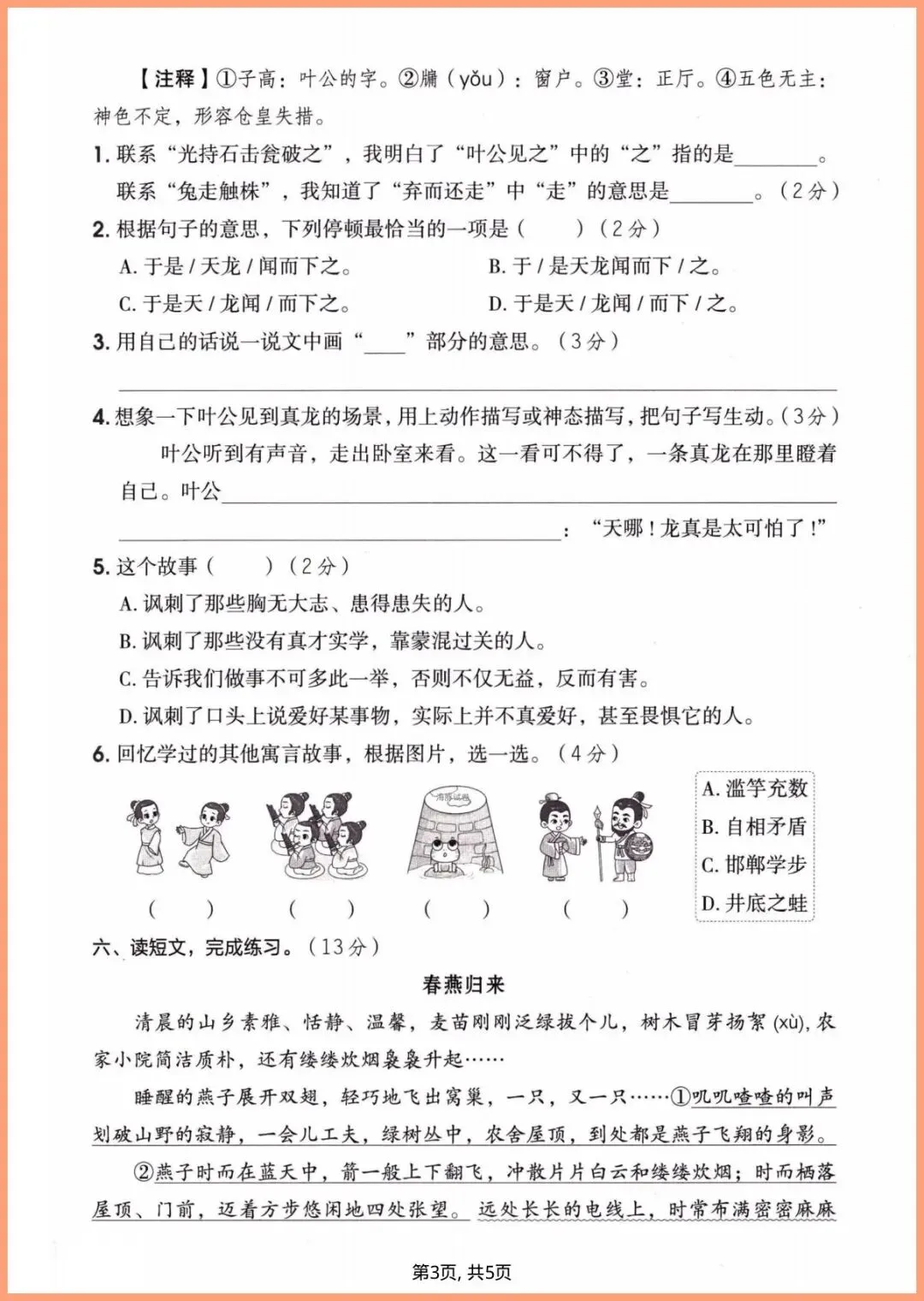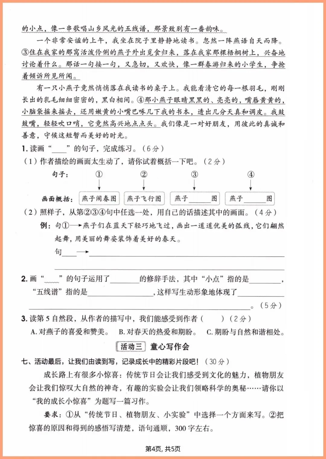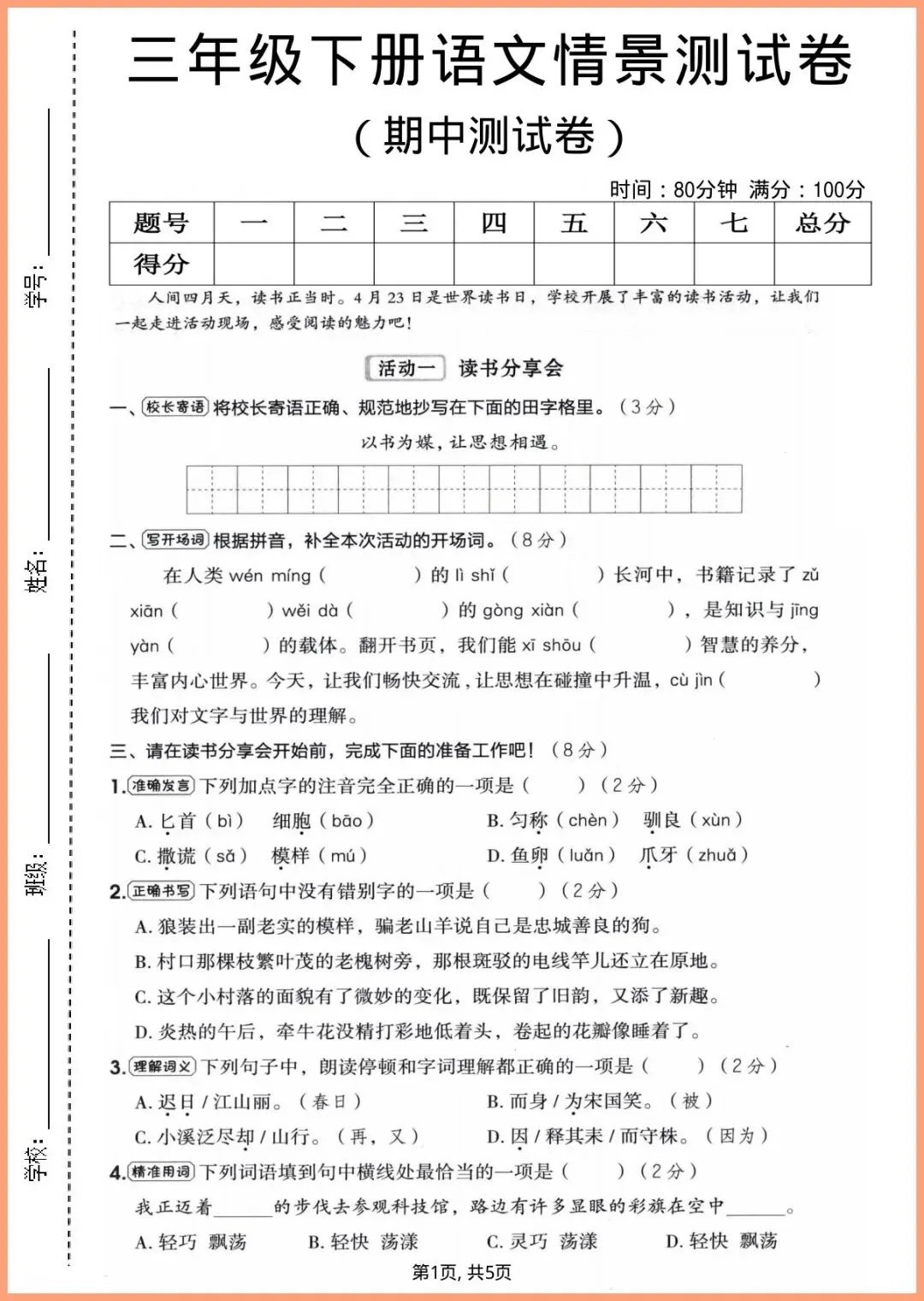 25年春人教版三年级下册语文期中情景测试卷,新鲜出炉5页电子版,手机一点就能打!这份小卷把“情景”玩明白了:校园义卖、春游观察、节气故事……阅读、写话、基础全装进真实场景里,孩子做题像闯关,练审题也练表达。每题配分值与点拨,家长一眼看懂错在哪,周末半小时,轻松堵住期中漏洞。想要的爸妈别等,现在打印,让孩子先练先稳!