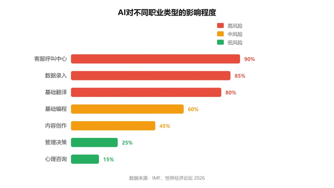 客服呼叫中心、数据录入员、基础翻译——这些高度重复、可量化、几乎不涉及情感交互的岗位,正在被AI系统快速接管。2026年初,IMF在一篇官方博客中明确指出:AI转型的影响比多数人想象的要深远,未来职场的成功与否,取决于当下是否果断开展技能投资和职业转型。