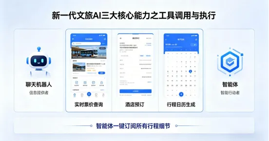 未来的文旅AI不仅是信息提供者,还可以调用外部工具——查询实时票价、预订酒店、生成行程日历。这使其从一个“聊天机器人”进化为“智能体”,通过智能体一键订阅所有行程细节。