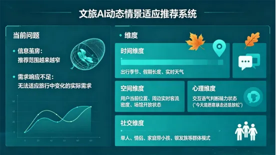 当前文旅个性化推荐多停留在静态标签阶段,系统根据用户过往行为打上“偏好古镇”“喜欢美食”等标记,反复推送同类内容。这带来两个问题:一是信息茧房,推荐范围越来越窄;二是无法响应旅行中随时变化的实际需求。
