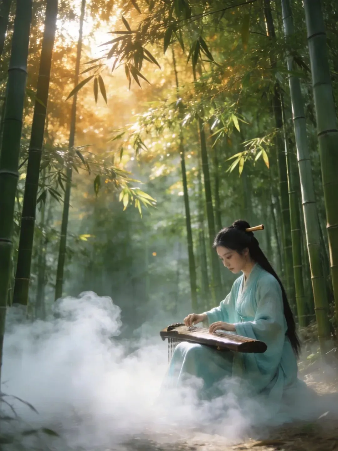 一位身着青色汉服的女子,坐在竹林石凳上抚琴,烟雾缭绕,午后阳光穿过竹叶,中国古风水墨画风格,8K超清,电影质感