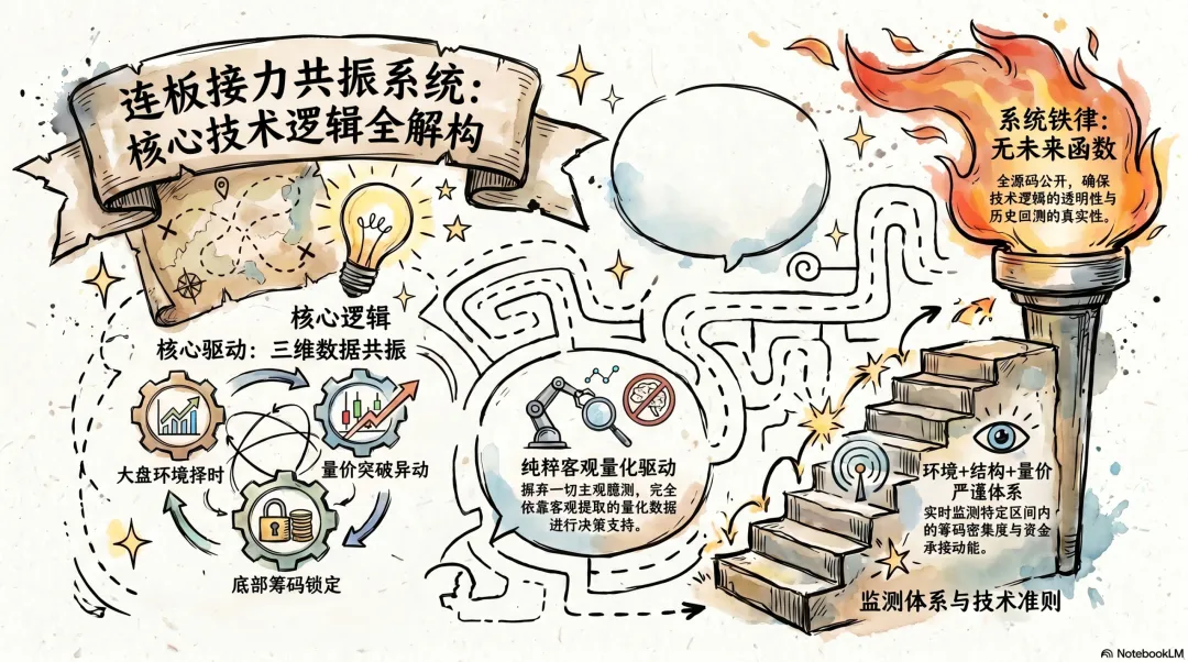 本模型名为【连板接力共振系统】,其核心技术逻辑基于大盘环境择时、量价突破异动与底部筹码锁定三维数据的共振验证。该模型摒弃了传统的主观臆测,纯粹依靠客观的量化数据提取,通过监测标的在特定区间内的筹码密集度与资金承接动能,为投资者提供了一套严谨的“环境+结构+量价”技术分析辅助工具。指标全源码公开,绝对不包含任何未来函数,纯粹为技术逻辑探讨。