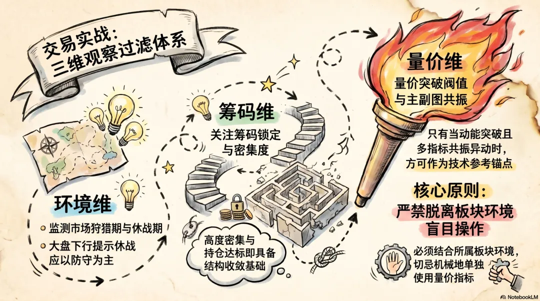 前置环境确认(环境维):模型内置了市场环境监测数据(狩猎期/休战期)。当大盘指数处于下行结构时,系统会提示休战期,此时应以防守为主,降低观察频率。