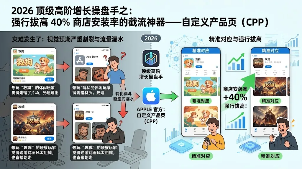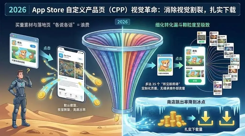 在流量极其枯竭的 2026 年,继续让你的买量素材和商店落地页“各说各话”,无异于将真金白银倒进下水道。App Store 自定义产品页 (CPP) 是一场将“转化漏斗颗粒度”细化到极致的视觉革命。