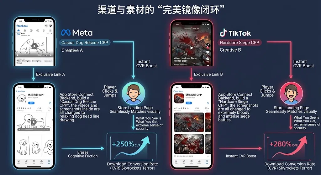 回到开头的例子,现在你应该怎么做? 在 App Store Connect 后台,建一个 “休闲救狗 CPP”,里面的视频和截图全换成解压的狗头画线。拿着这个专属链接去投 Meta 上的素材 A。 再建一个 “硬核攻城 CPP”,截图全换成极其血腥震撼的攻城战。拿着这个链接去投 TikTok 上的素材 B。
