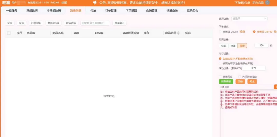 活动改销:一键修改销量数据,提升商品排名,吸引自然流量。 -