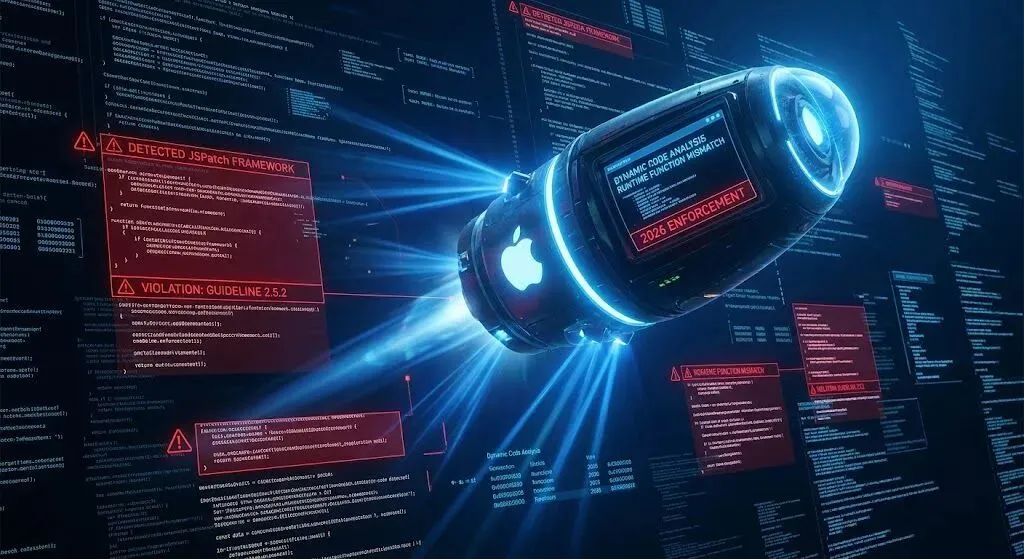 进入 2026 年,Apple 决定对这种公然藐视其生态主权的行为执行“死刑”。《App Store 审核指南》2.5.2 条款明确宣告:应用绝不允许下载、安装或执行会改变应用核心特性的代码;同时,Guideline 2.3.1(隐藏功能)严禁应用在审核后改变其宣传的核心目的。 一旦苹果的底层探针在动态运行或静态扫描中,嗅探到了非法的代码动态下发框架,或者发现应用在运行时实际展示的功能与商店元数据严重不符,该应用将瞬间遭遇秒杀,开发者企业主体将面临永久 Termination(终止)且绝无申诉可能。本文为您深度解析苹果热更新风控查杀逻辑与合规沙盒架构体系。