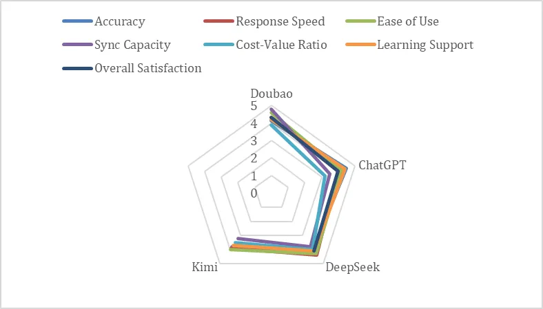 Doubao’s high synchronization score (4.8) is closely associated with its leading market share, highlighting seamless device switching as a key driver of student adoption; meanwhile, despite ChatGPT achieving the highest accuracy rating (4.5), frequent fact-checking remains common, indicating that perceived accuracy does not necessarily translate into full academic trust, while DeepSeek’s favorable cost-value evaluation has not resulted in higher usage, suggesting that price advantages alone are insufficient to sustain adoption.