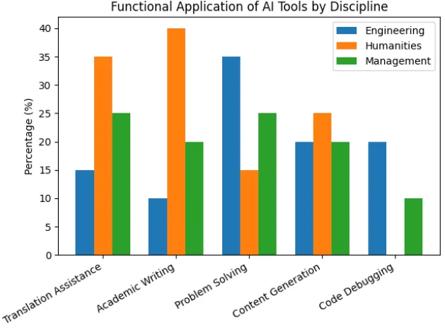 AI tool usage shows clear disciplinary differentiation, with engineering students focusing on problem solving and code debugging, humanities students prioritizing writing and translation, and management students displaying more balanced functional use.