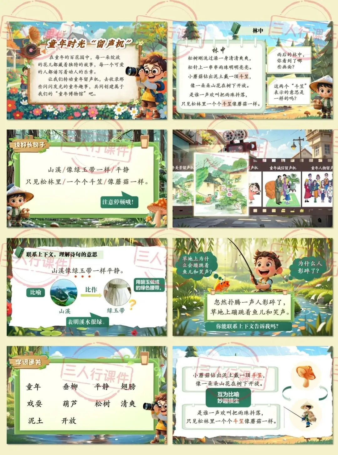 生2:我找到了“一串串”和“一个个”。“松针上一串串雨珠明明亮亮”和“只见松林里一个个斗笠像蘑菇一样”。