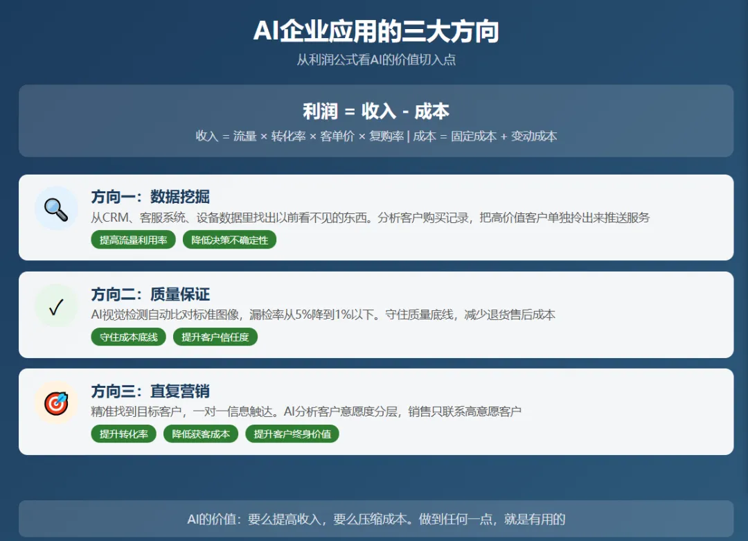 其实不用问「AI能做什么」,要问「我的利润公式里,哪个变量可以被优化」。数据挖掘帮你提高收入效率,质量保证帮你守住成本底线,直复营销帮你提升转化和复购。