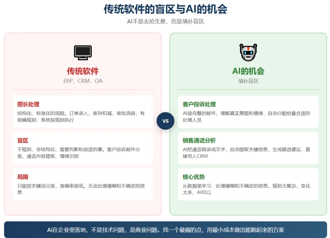 讲完了三个方向,我想再说说机会在哪里。AI在企业里落地,不是去跟现有的软件系统抢生意,而是要去填补那些传统软件覆盖不到的盲区。