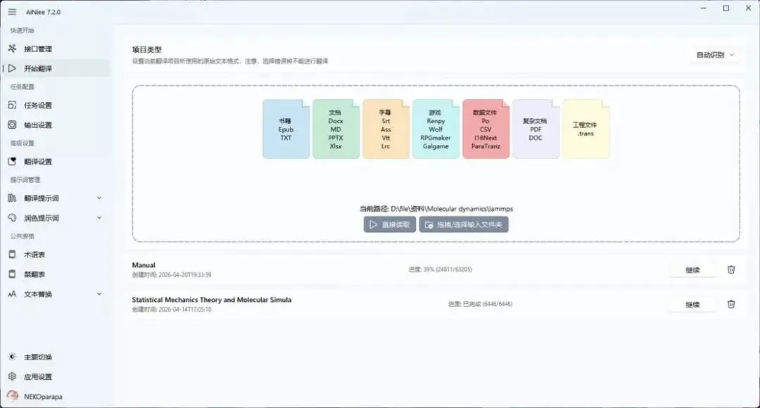 是时候升级你的科研工具箱了!推荐这款专为长文本打造的AI翻译神器——AiNiee。它不同于普通的网页翻译,而是采用了先进的“思维链翻译”技术,能够像人类专家一样理解上下文语境。更关键的是,它支持“AI术语表”功能,你可以预先导入分子模拟的专业词汇,强制AI按照标准学术规范进行翻译。无论是PDF格式的英文教材,还是Word格式的实验文档,只需“一拖一点”,喝杯咖啡的功夫,生涩的英文瞬间变成通顺的中文,让你的文献阅读效率翻倍!